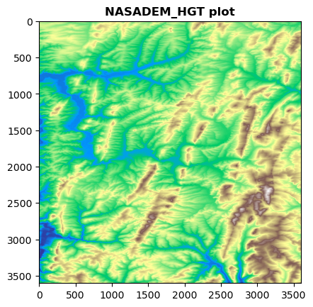 from rasterio.plot import showshow(arr[0], cmap ='terrain', title="NASADEM_HGT plot")