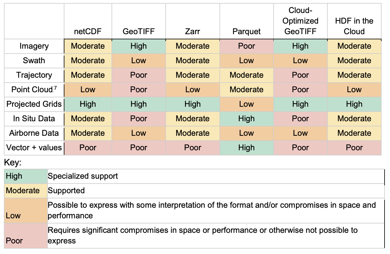 | Zarr, Kerchunk, Icechunk | Multi-dimensional raster | ESDIS and OGC standards in development |